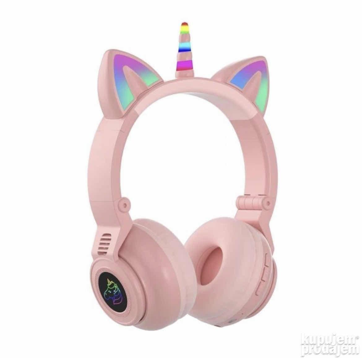 Bluetooth bezicne slusalice sa mačijim ušima i rogic jednoroga. Sa ugrađenim LED trepćećim svetlom (na ušima i rogu). . . Lako se povezuju putem Bluetooth-a . . . Snaznog i jakog zvuka, sa ugradjenim mikrofonom. . . Pune se preko USB kabla koji dolazi u pakovanju. Mogu se sklopiti, ne zauzimaju mnogo mesta, lake i kompaktne. . Jako kvalitetne. . . Podrzava memorijsku karticu do 32GB.