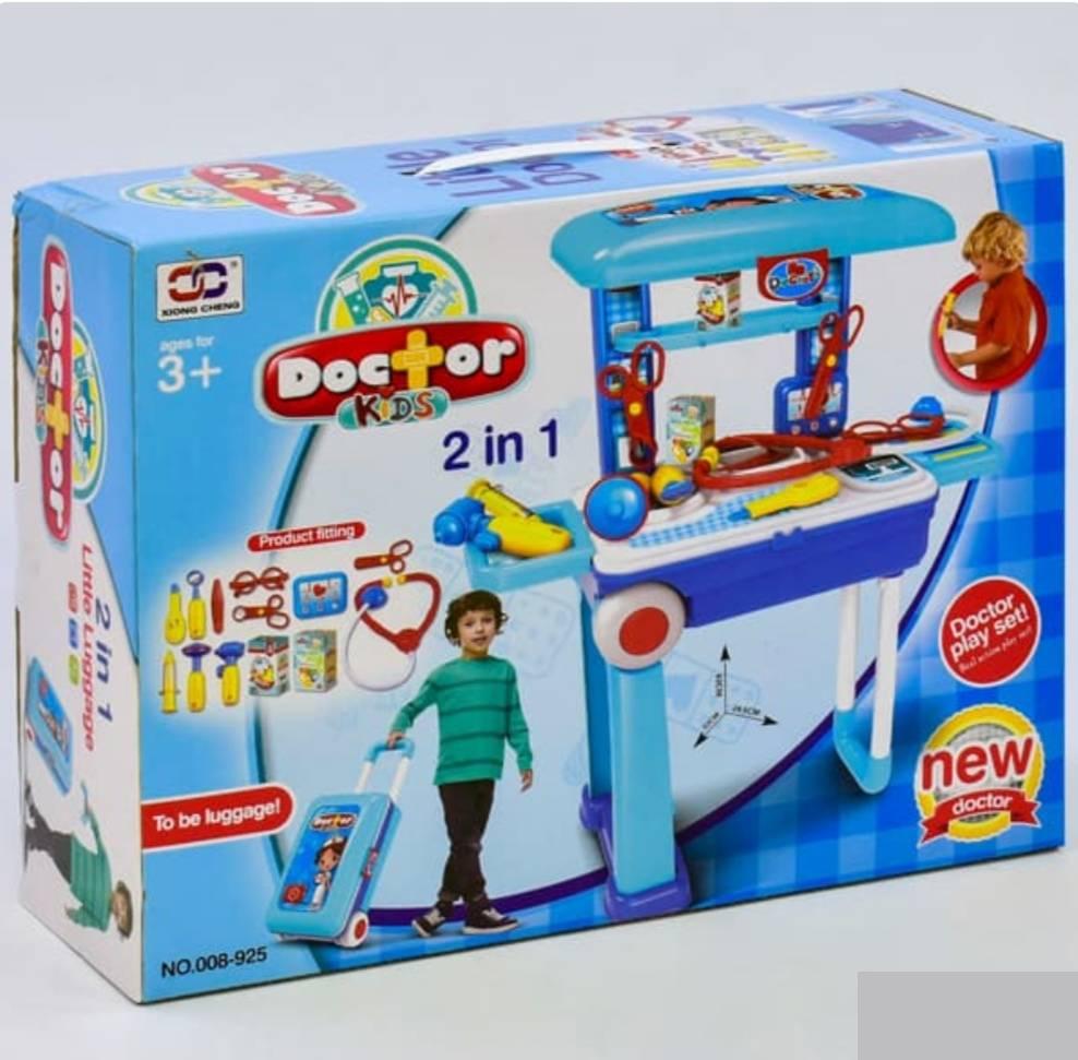 Među medicinskim instrumentima beba će naći: stetoskop, ENT instrumente, makaze, špric, termometar i druge instrumente. Uzbudljiva igra lekara pomoći će deci da se upoznaju sa medicinskim alatima i prevaziđu strah od medicinskih ordinacija. Medicinski sto se nalazi u praktičnom koferu sa točkićima sa dugom ručkom.