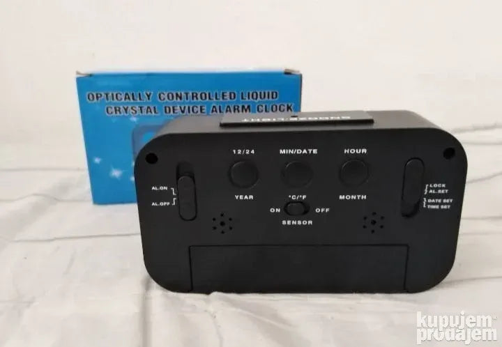 Sat-alarm sa velikim LCD displejem koji pokazuje vreme, datum, temperaturu i status alarma. Pritiskom na taster odozgo uključuje se plavo pozadinsko osvetljenje, koje traje nekoliko sekundi. Istim tasterom se utišava alarm.