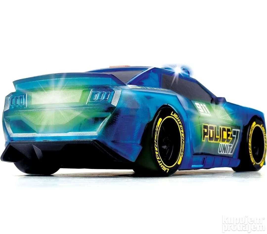 Policijski svetleći auto ima dugmiće na krovu koji aktiviraju muzicke ili svetleće efekte a takođe se pokreće sve brže i brže
