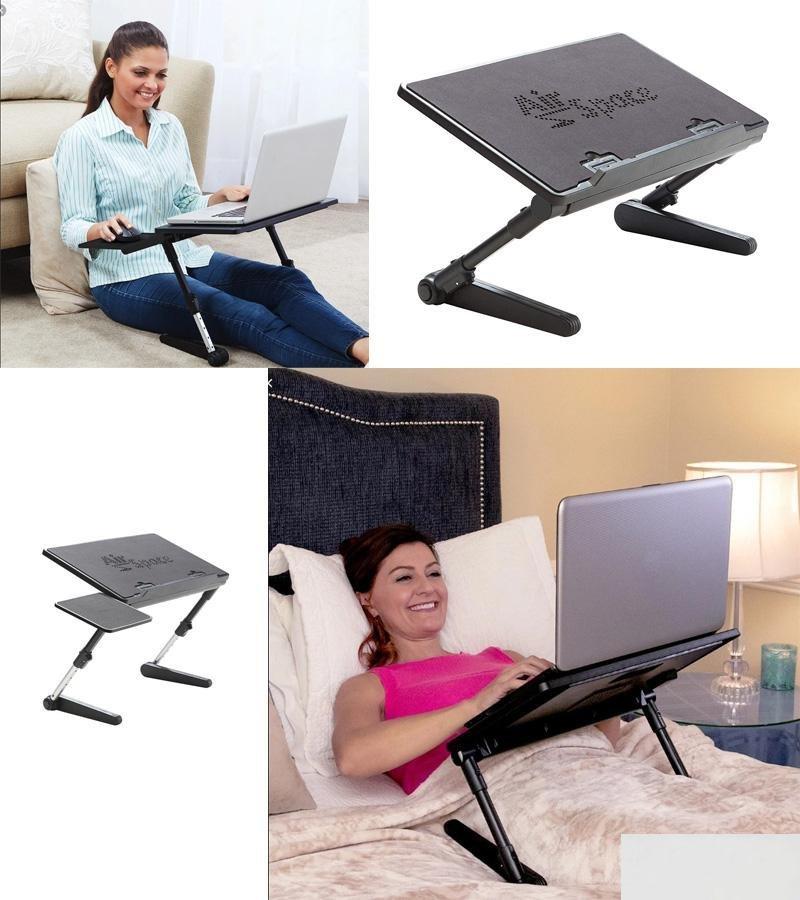 Takođe, sklopivi, podesivi stočić se može koristiti i za rad na laptopu iz kreveta. Zaboravite na nezgodno uvijanje i traženje položaja dok pokušavate da se namestite. Sada, sa Air Space stolom za laptop – bićete u savršeno udobnom položaju. Njegove podesive nogare, mogu se postaviti u bilo koji položaj, što otvara mnoge, fantastične mogućnosti. Takođe se podešava i lako zaključava pozicija postolja na kojem će laptop stajati, što je velika prednost. Uz granicnik koji se može podići, laptop neće pasti niti skliznuti, pa možete biti sigurni i fokusirani na posao u potpunosti. Kao dodatan plus je mali ventilator na dnu stola koji će onemogućiti pregrejavanje, čak i ako ste satima u poslu. Materijal: Aiuminum, plastikaDimenzija ploce za lap top: 48cm x 24cm