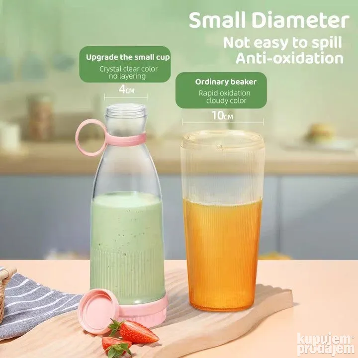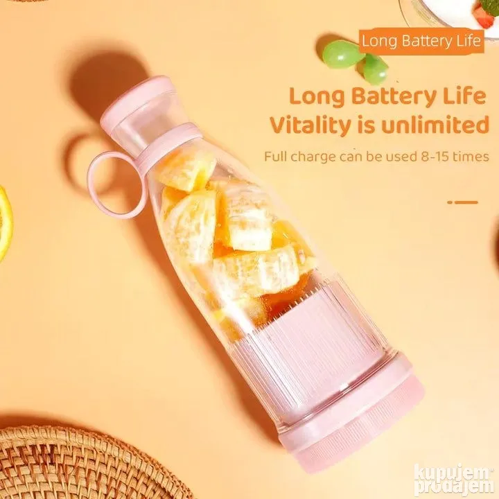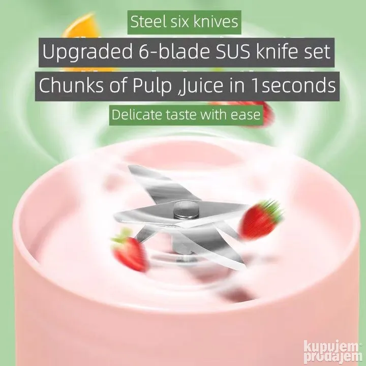 Kapacitet 300 mililitara Dimenzije proizvoda 32D x 8V x 8H cmMaterijal Vlakna i silicijum Jednostavna za pravljenje zdrave hrane Ovo je mikser za voće velike brzine sa 6 veoma oštrih sečiva za ekstrakciju od nerđajućeg čelika. Prenosivi blender ima moćan motor od 5V sa snagom od 40V za hranljivo piće za 30 sekundi. Multifunkcionalni blender. Prenosivi mini blender je odličan za pravljenje ukusne hranljive hrane, postizanje ciljeva u ishrani i fitnesu, zdrava ishrana za bebe. Napunite svoje telo vitaminima koji su mu potrebni uz sok bogat hranljivim sastojcima, šejk ili smoothie u bilo koje vreme i bilo gde. USB punjenje. Ovaj prenosivi blender od 350 ml može se potpuno napuniti za oko 1-2 sata, a potpuno punjenje može proizvesti do 10 šolje soka I može se puniti preko bilo kog USB porta. Blender ima silikonsku ručku za laku prenosivost. Možete ga staviti u putnu torbu da biste uštedeli prostor, tako da možete da pijete svež sok bilo kada i bilo gde, na primer da ga koristite kod kuće, u kancelariji, teretani, na putovanju ili bilo kojoj drugoj aktivnosti na otvorenom i pijete svež sok.