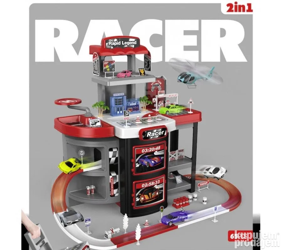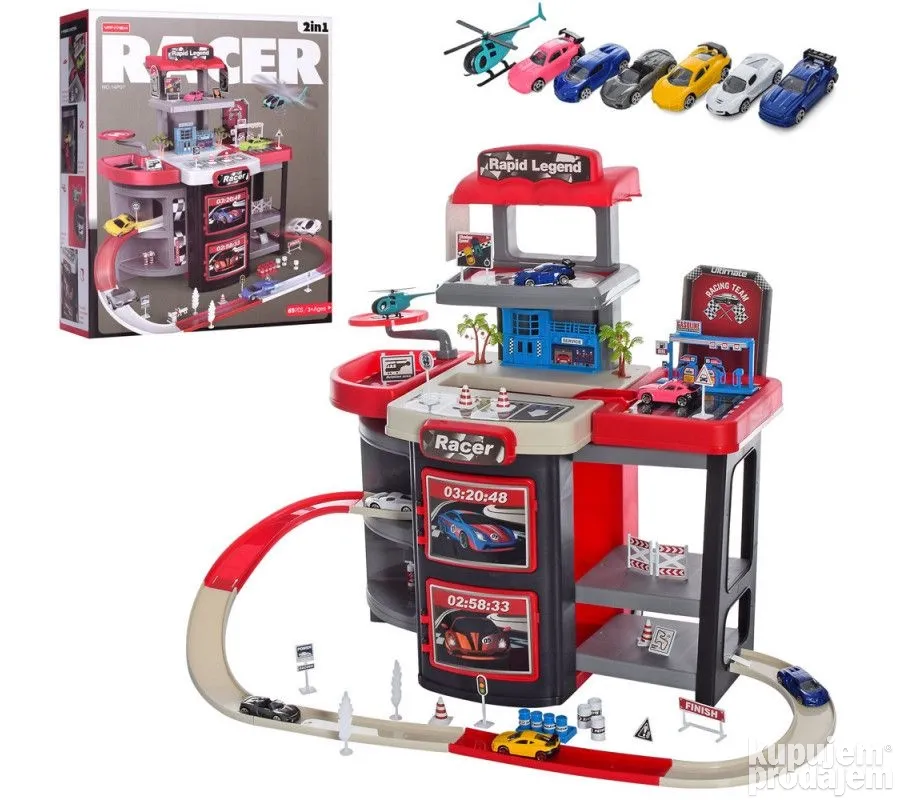 Set se sastoji iz 65 delova: benzinska pumpa, parking, heliodrom, znakovi, 6 autica, 1 helikopter…